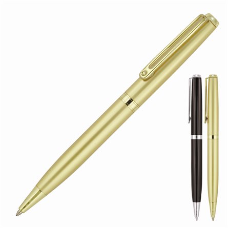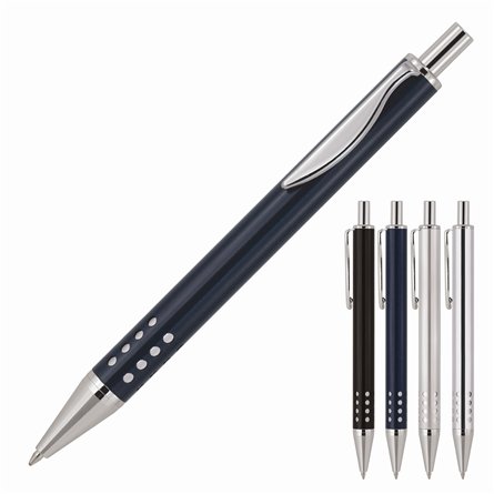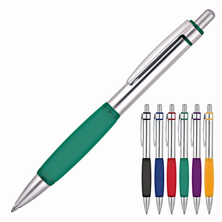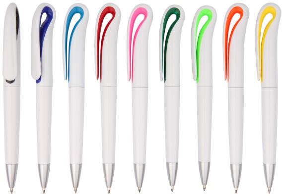 Twist action plastic ball pen, two components injected upper barrel and solid white below barrel, silver sprayed tip. Lime, Yellow, Black, Red, Orange, Royal